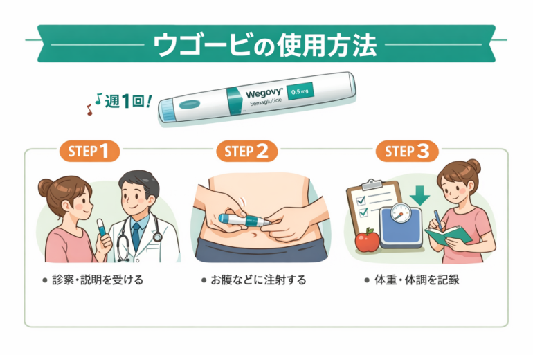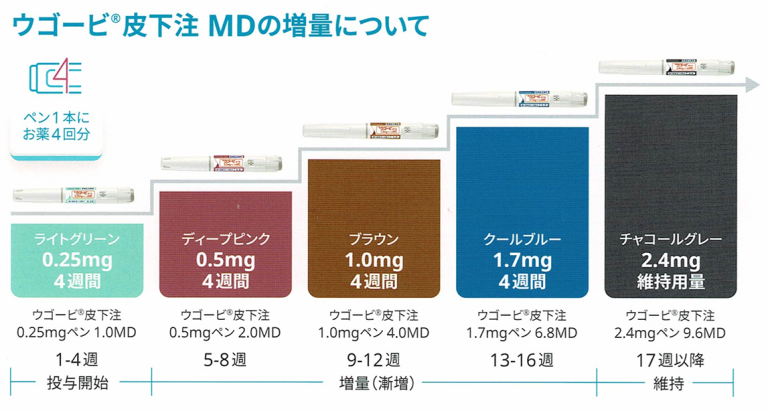 ウゴービ®は、週1回の注射を4回行い、増量していく製剤です。