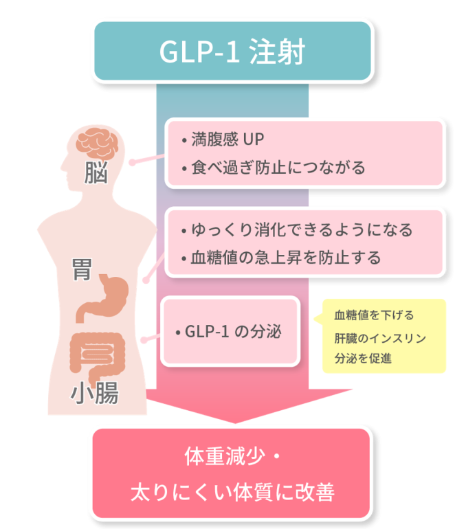 - GLP-1作用により 食欲を抑え、満腹感を持続させることで体重減少をサポートします。